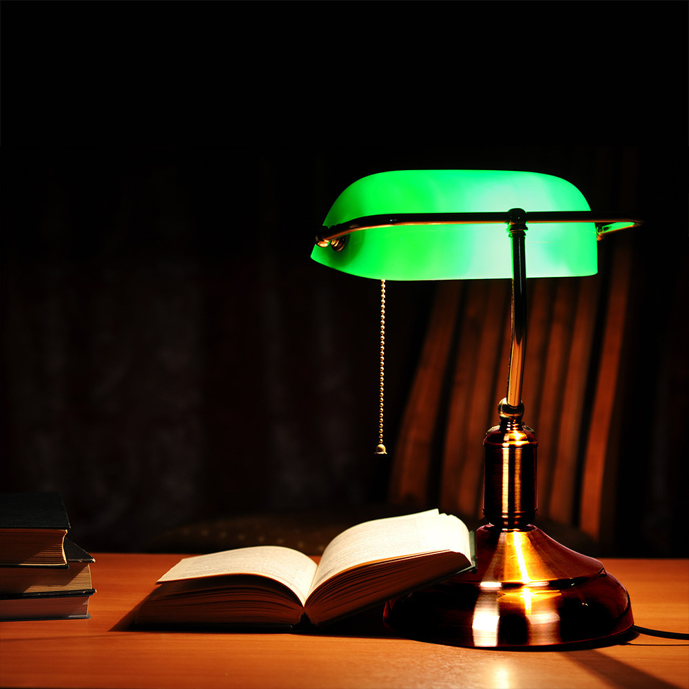 El flexo ABOGADO está fabricado de metal en color cuero y la tulipa es de cristal en color verde. El diámetro de la base son 18 cms. Posee 1 portalámparas E-27 (rosca gruesa) apto para bombilla LED (No incluida). Lleva una cadena en el portalámparas para encender y apagar la luz. Tiene 2 años de garantía.